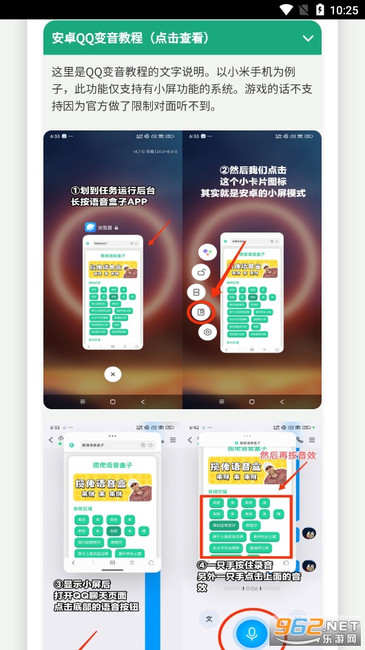 多场景应用:适配社交软件(如、QQ),通过小屏模式实时变音发送,实现好友恶搞或朋友圈整活。