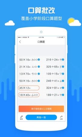 2、覆盖小学阶段口算题型:支持小学阶段各类口算作业批改,轻轻一拍秒出批改结果