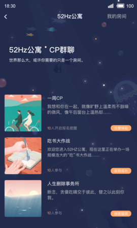 1、为你打造你专属的社交房间,大家可以根据自己兴趣爱好选择最适合的自己的房间聊天休息哦!