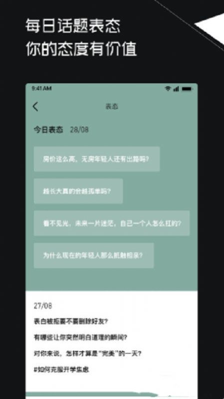 2、每天都会为用户提供可以进行聊天探讨的话题信息,对于每日的话题进行表态,表达自己的态度价值观,与其他三观相同的用户取得共鸣。