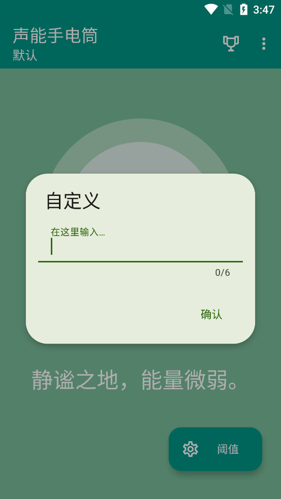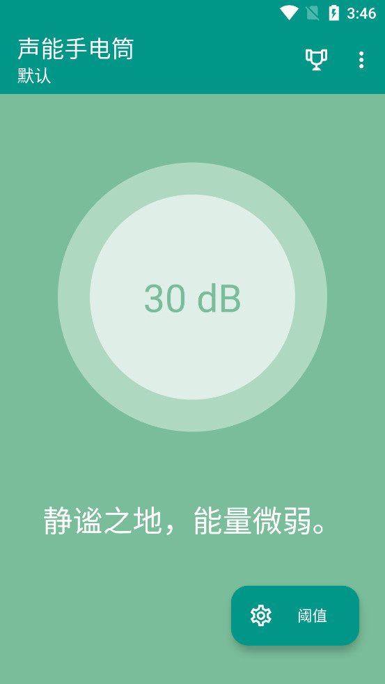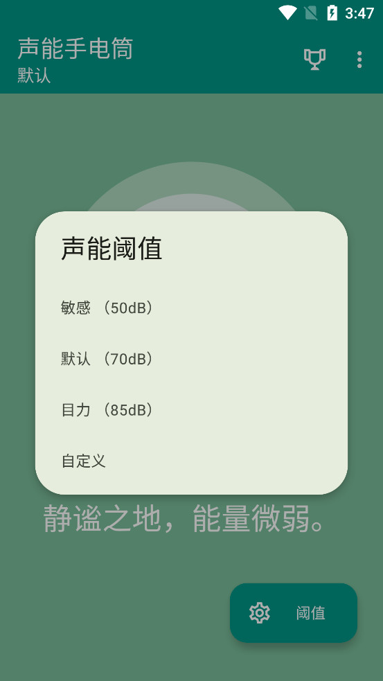 默认的设定是>70分贝的声音可以触发,你也可以在右下角设置绿化。无联网及存储权限