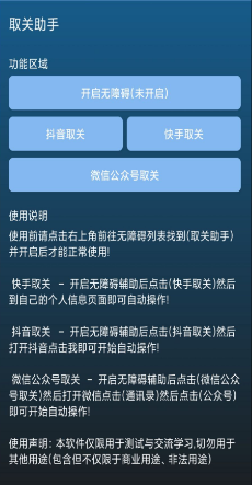 使用前请点击右上角前往无障碍列表找到(取关助手)并开启后才能正常使用