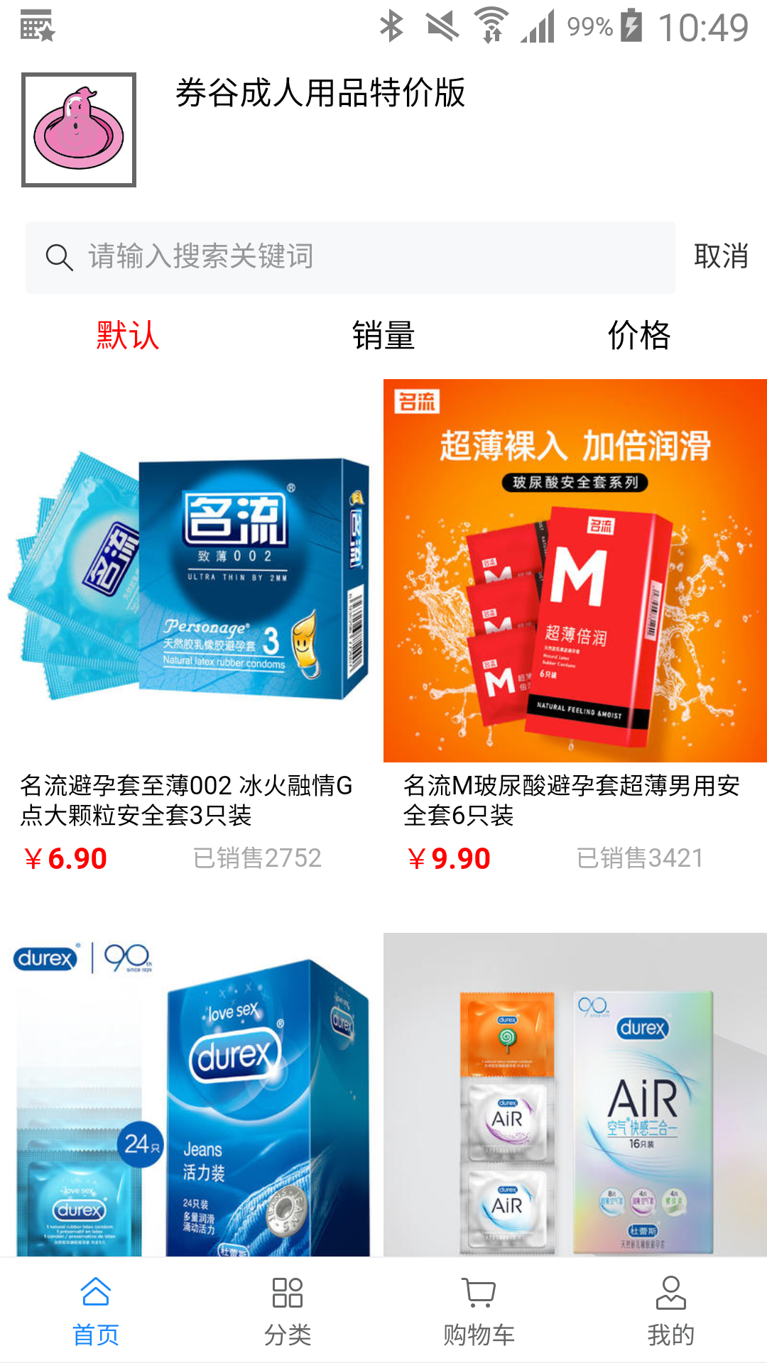 买套套更便宜的APP、更有成人情趣用品包括单男用品、单女用品、情趣用品、延时用品、润滑香水、SM玩具等新款发布,注册送50、浏览商品送2,上不封顶。本APP不建议18岁以下载