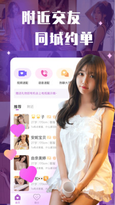 约聊app是一款当今网络非常火爆有趣的手机交友软件,在附近秒约中你可以拥有着超多单身男女,与你在线进行互约,进行聊天交友,而且在附近秒约中,你只需要打开APP就可以发现附近更多的单身男女,让你能够快速进行脱单,当然,别人也能够发现你,并加你为好友,与你互动交友。