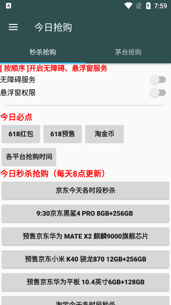 专门为618活动打造的一款全新的抢购助手工具,今日抢购助手1.0最新版app是个免费的应用,功能很强大,支持全网京东,淘宝及苏宁易购的抢购活动,软件简单易用好用,操作简单,一键操作,不用过多的设置。