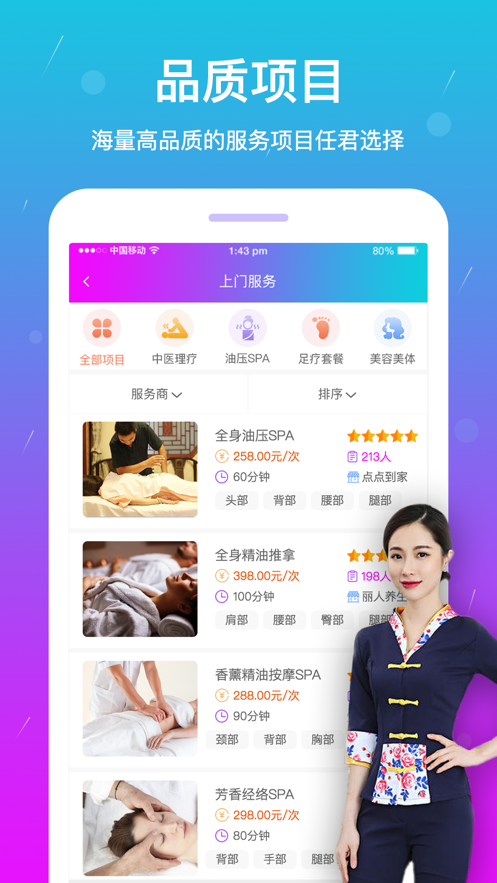 4.上门服务:可以根据自己的身体情况,选择适合的按摩项目,查看项目介绍,可以筛选服务商,按销量排序,按评价排序,按好评排序。