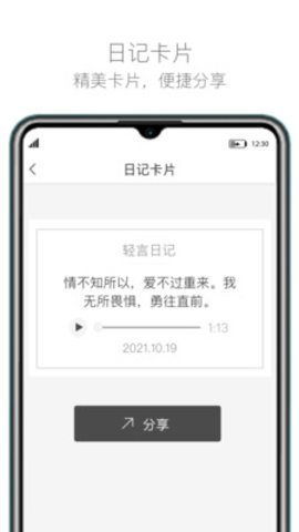 轻言日记app是一款简洁好用的记事本,支持语音日记,精美的卡片自由切换,简单的UI设计视觉感受十分舒适,各种生活喜怒哀乐都可以在这里表达出来,赶快来试试吧