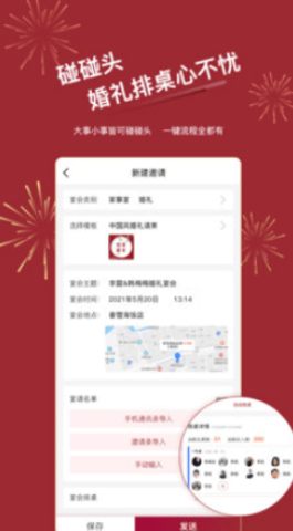 碰碰头app是一款非常有特色的交流互动平台,帮助用户们实现一键转发祝福等功能,适合办理一些重要的宴会邀请嘉宾,给大家带来了很多方便,所有的账目信息都能在手机上查看哟,记录的非常的清楚,需要的用户们就快来下载吧。