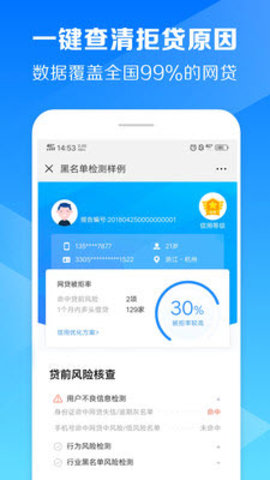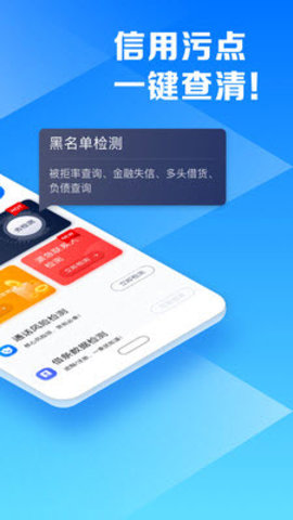 一键进行黑名单检测,包括被拒率查询、金融失信记录、多头借贷、负债查询等功能全部都可以查询,信用污点一键查清!