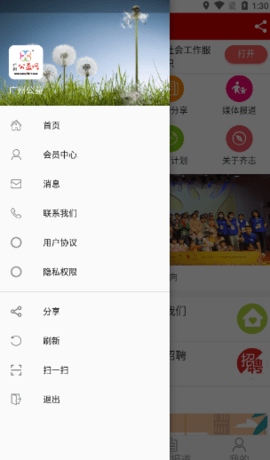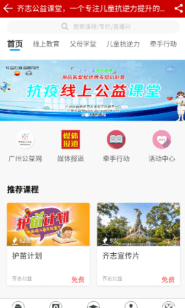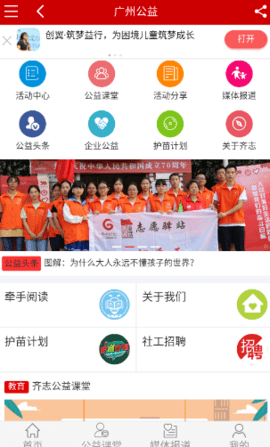 广州公益app包括活动中心、公益课堂、活动分享、媒体报道、公益头条、企业公益、护苗计划、关于齐志等板块。
