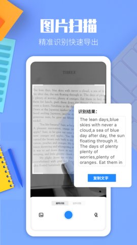 1、手机提取文字:可连续拍照拼图识别图文或即时拍照识别各种文件、图片、书籍等,即识即译,准确迅速!手机拍纸质文档,智能裁边调节图像参数,识别结果自动排版,保留原文排版。