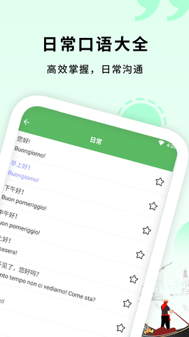 意大利语入门app教你轻松学会意大利语,这是一款专业的意大利语学习软件,拥有丰富的场景对话训练,还提供了海量词汇、常用语、标准发音等学习内容,,帮助用户快速入门,有需要的朋友欢迎前来下载体验。