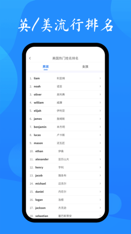 英文名取名助手app可以按热度,字母,首字母,性别等各种条件筛选英文名,还会根据用户的中文名智能匹配适合的英文名。