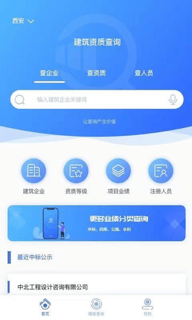 建筑行业查询app带你快速了解建筑行业的最新资讯,这款软件拥有详细的企业资质、基本信息、工程项目和注册人员等信息查询功能,可以帮助用户清楚的查询建筑企业资质信息,让用户能了解到更多的信息内容,有需要的朋友快来下载体验吧。