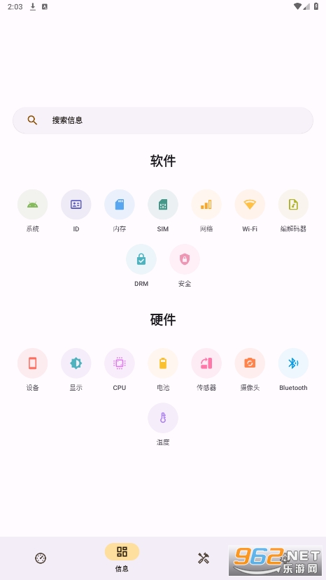 3、在信息栏可以查看软件和硬件信息,包括系统、ID、内存、显示等。