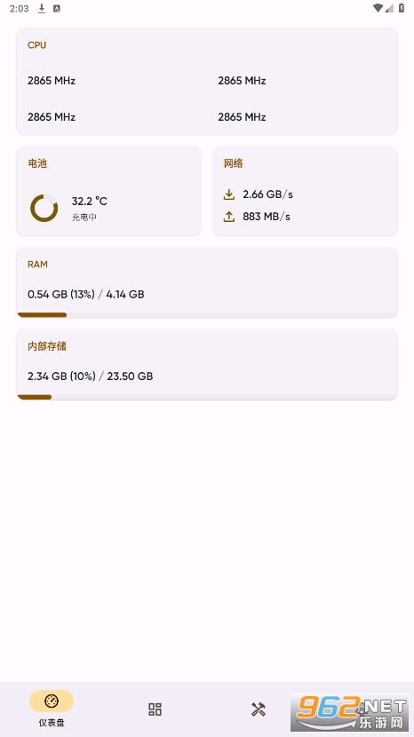 2、进入软件首页,在仪表盘可以查看CPU、电池、网络、RAM等信息。