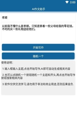 AI作文助手app是一款非常好用的手机辅导作文软件哟,直接输入标题能够自动生成作文,但是这款app是一个辅助软件只能生成开头让我们有写作的灵感,后续还是需要自己来写作,起到了一个非常好的辅助软件。