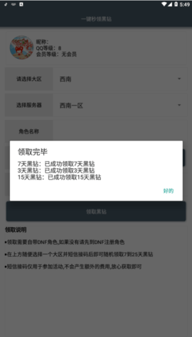 一键秒领黑钻app能够让大家一键领取25天黑钻特权哟,非常的好用,甚至于有机会获得永久黑钻特权,喜欢玩dnf游戏的朋友们就快来下载使用吧,月底就要截止领取啦。
