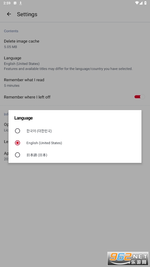 1、lezhin软件没办法设置中文,点击左上角的目录,settings—language里面,只有英文、日语、韩语的选择。