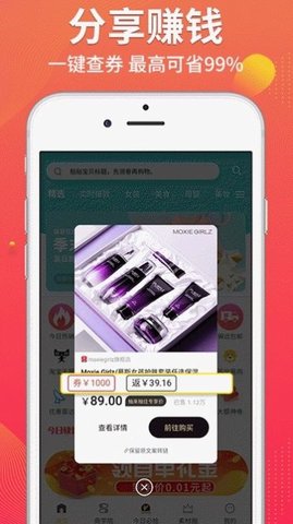 2、分享赚钱:一键查券最高可省99;