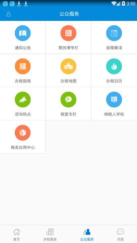 2、【公众服务】 查看办税日历、办税地址、办税指南、公告信息、税务法规等信息。