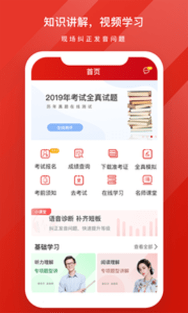 在线审核个人信息、报名、缴费、考试、查成绩一条龙,足不出户提升口语水平,完成技能考试。