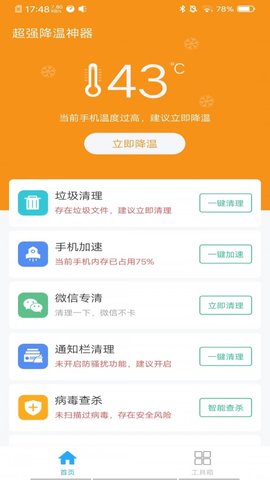 手机超强降温神器app是一款便捷实用的手机降温软件,这款软件能帮助用户解决手机发热、卡顿、空间不足等问题,当手机温度过高时,自动进行降温处理,保护手机,减少损耗,有需要的朋友快来下载吧。