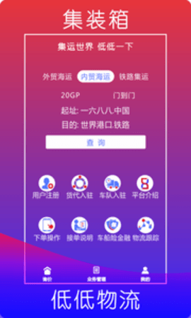 低低海运物流app旨在助力十万+货运代理、车队在线上提供信息服务的集装箱物流电商平台”,为找货主、找物流、找车队提供全面的集装箱物流信息服务;一秒匹配运价,简单、快速、有效,为货主提供大数据化时代的集装箱物流新体验。
