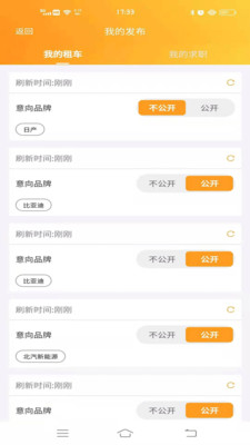 2、司机端发布租车需求/求职需求,公司端首页展示司机端发布的租车需求/求职需求和公司端发布的卖车/求购信息。