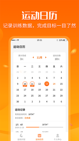 2、运动日历,记录训练数据,完成目标一目了然
