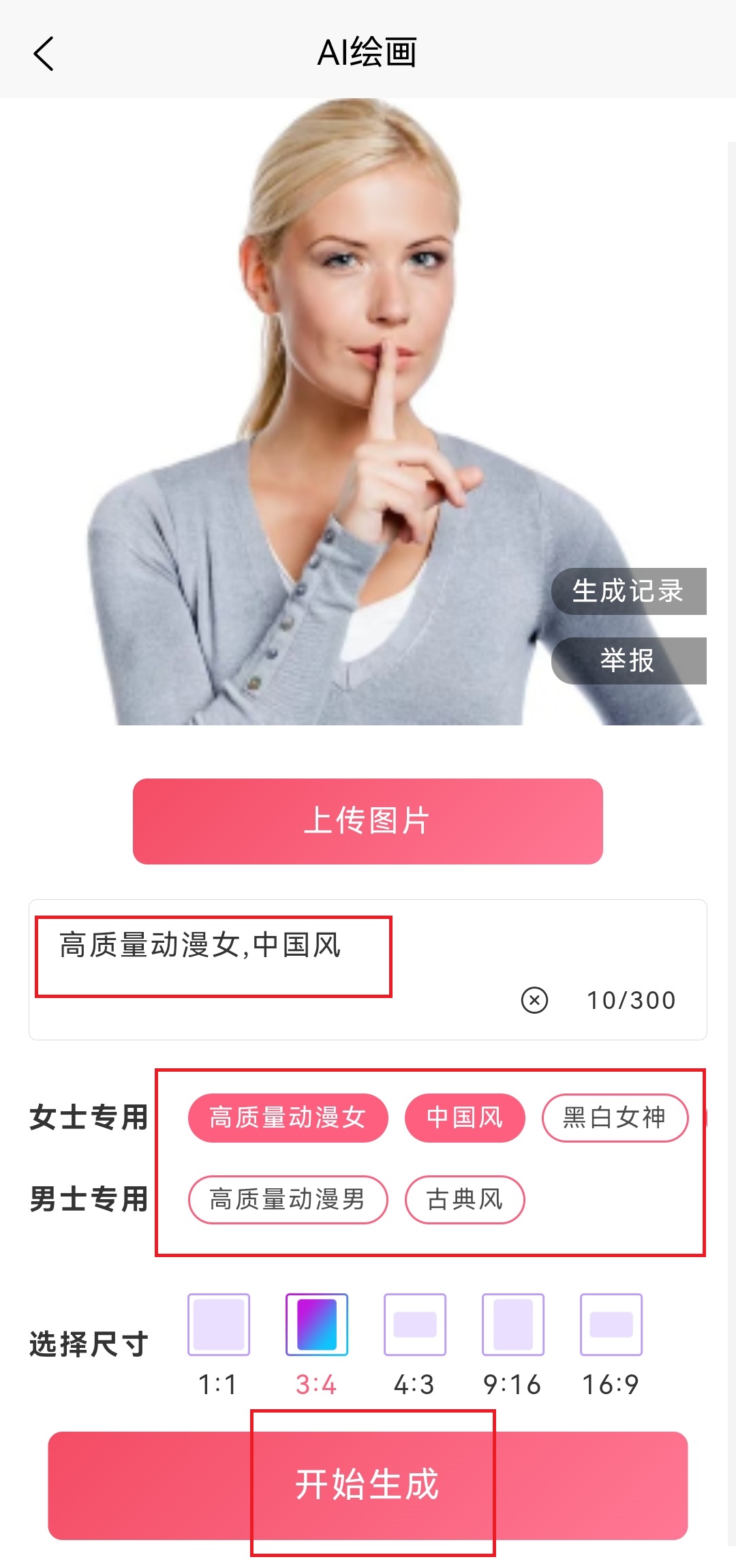 2. 上传你想要处理的照片,选择系统推荐的漫画风格,或手动输入关键词定义风格,并设置输出图片的尺寸。