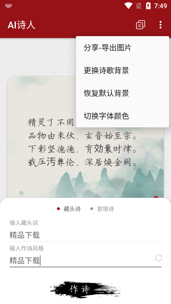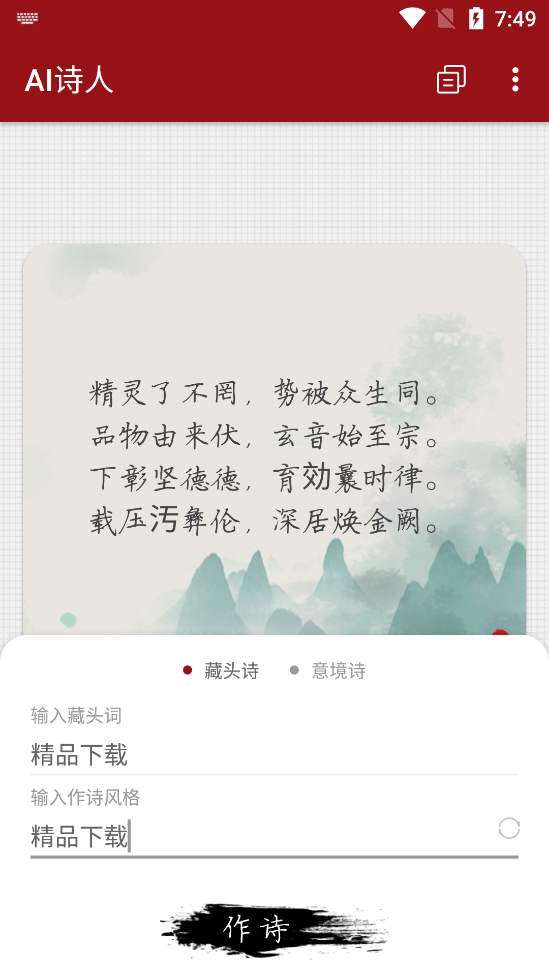九歌团队打造的一款智能ai生成诗的应用,AI诗人AiPoet1.0新版是一个真实好用没有广告完全免费的藏头诗和意境诗生成器,简单好用,生成的诗高大上,用来装x很不错。