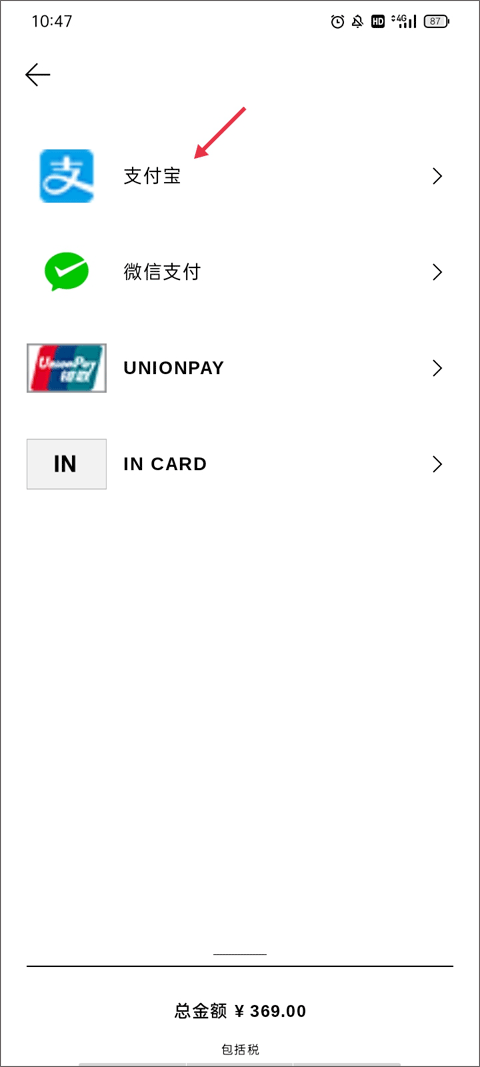最后选择支付方式——支持支付宝、支付、银联及IN等多种渠道,确认付款后即完成整个购物流程。