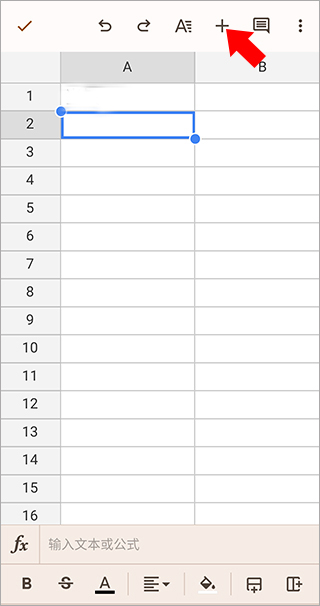 1. 点击目标单元格,再点击顶部工具栏的+”号。