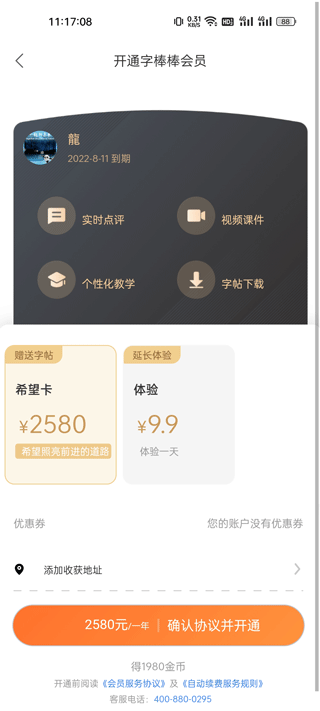 新用户注册即享7天VIP免费体验,全面开放所有课程与功能。正式会员年费2580元,包含全套课程、AI点评服务及实体字帖赠送;另有9.9元/天的短期体验选项。开通会员后,所有内容无额外收费,一次付费,全年无忧使用。