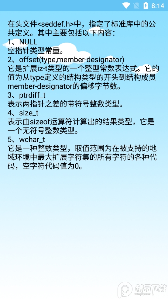 应用内嵌专业级技术文档节选,帮助用户深入理解C语言底层机制。例如,在头文件<stddef.h>中定义的关键类型包括:
