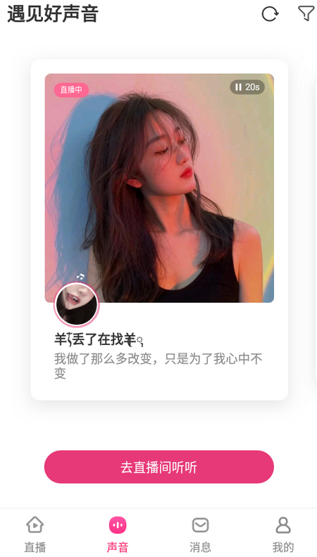 鱼声直播语音平台,是一款以声音为纽带的沉浸式语音社交App。在这里,颜值不设限,才华靠声”动——无论你是想轻松解压、畅聊心事,还是邂逅心动的声音,鱼声都能为你打造一个无压力、高互动、超有趣的语音世界。用耳朵去认识人,用声音去交朋友,一切从打开鱼声开始!