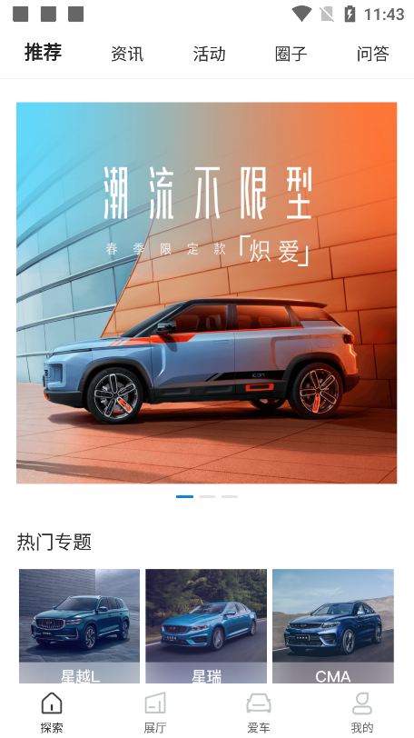 全新界面设计融合社交、内容与服务,打造沉浸式用车生态。探索板块持续推送新鲜资讯与潮流玩法;车辆展厅一键直达全系车型详情;吉利圈子连接全国车友,分享精彩用车生活;个人中心则整合账号信息与爱车管理,让每一次操作都高效便捷。