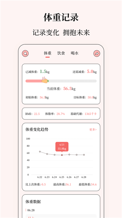一站式健康管理:覆盖从食物查询、饮食记录、运动追踪到身体指标分析的完整闭环,满足减脂、增肌、维持体重等多元目标需求。