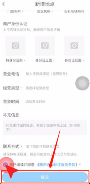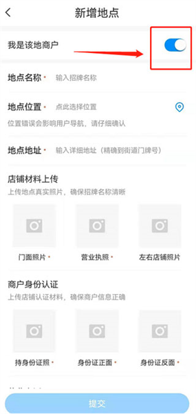 5. 开启我是该地商户”开关,并按要求填写店铺信息
