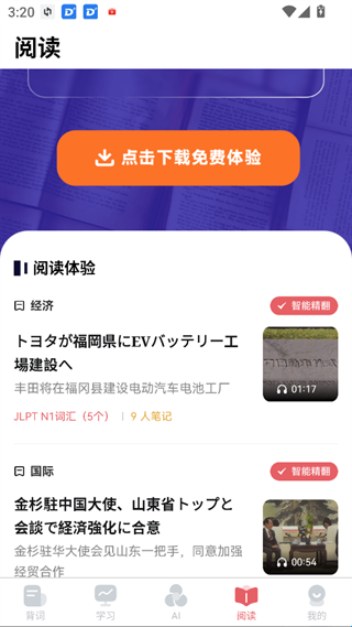 4、阅读:针对日语阅读听力精心设计,每篇文章提供阅读听力音频,短文书籍新闻内容每日更新,点击即可学习