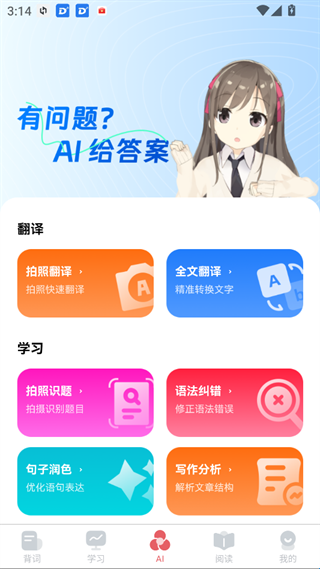 3、AI:有问题?Al给答案,内置翻译、学习和记忆等各种小功能如【拍照翻译、拍照识图等等】