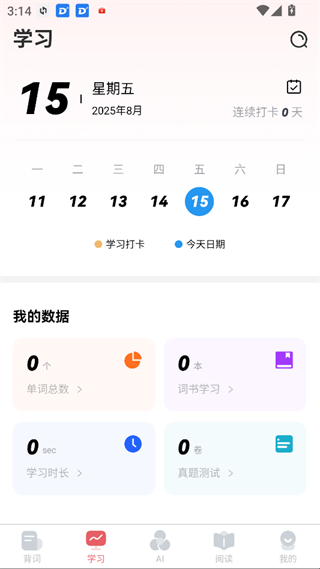 2、学习:提供各种学习数据还能每天打卡提醒自己学了多少