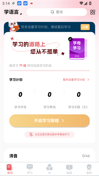 1、背词:点击即可开启学习旅程,左上角可切换选择学习类别