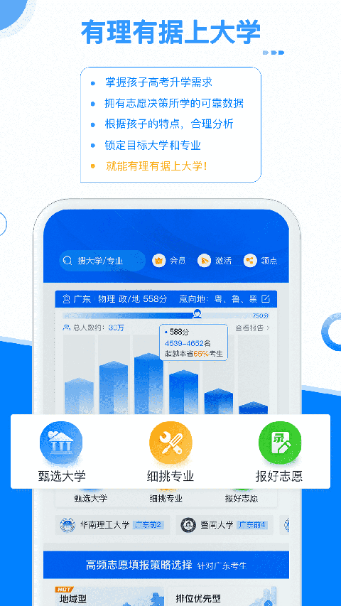升学看点:覆盖25个分省垂直频道,实时推送大学介绍、专业解读、政策变动等高价值内容,让你第一时间掌握与自身相关的升学动态。