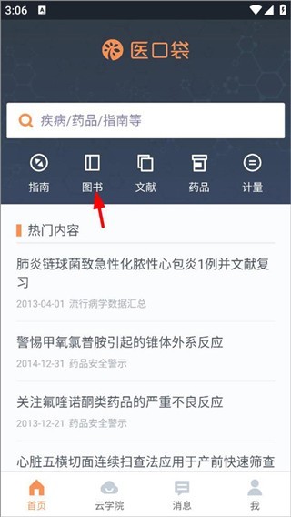 打开医口袋App并登录后,进入首页即可看到热门内容推荐。点击图书”入口,快速进入医学教材专区。