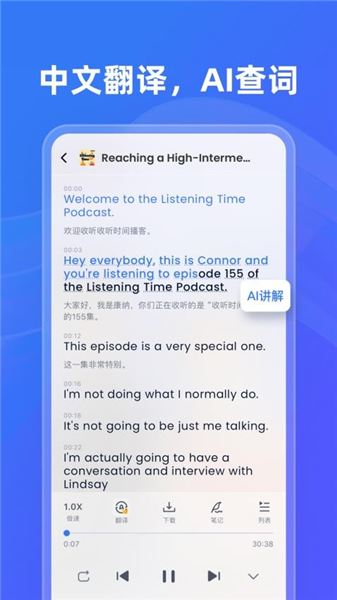 ListenLeap免费版不仅提供丰富的英语播客资源,更融合了多项实用学习工具。支持一键查询生词,快速获取精准释义;打造全英文沉浸环境,助你自然习得语感;学习过程中可随时添加笔记,记录重点语法、文化背景或个人感悟,让每一次收听都转化为扎实的语言积累。