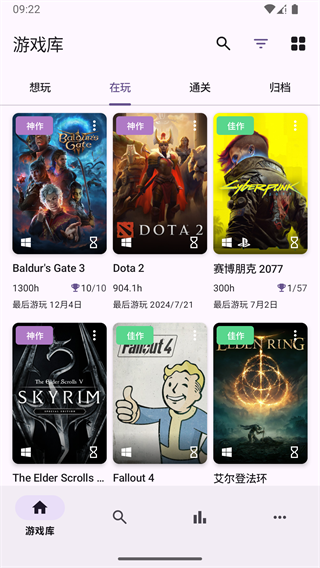 1、 手动添加或平台同步游戏,并自定义分类标签,实时更新游玩进度与状态。