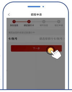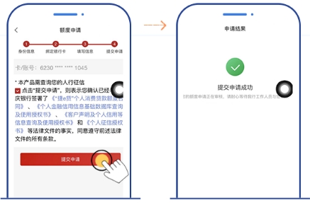 4. 添加银行卡信息,点击【提交申请】,系统将自动审核并快速授信出额。