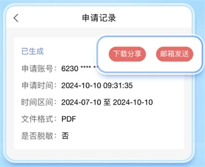 5. 进入【申请记录】,点击【下载分享】,可选择通过邮箱发送、分享或本地保存等方式留存您的电子流水。